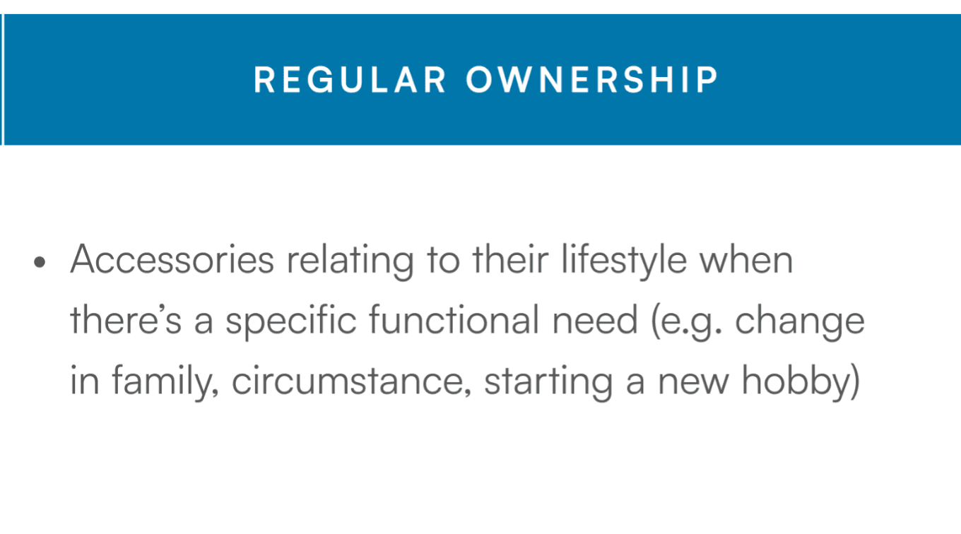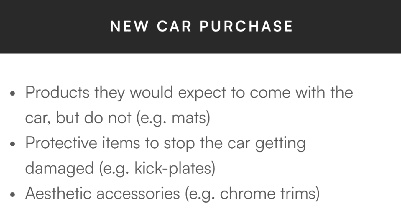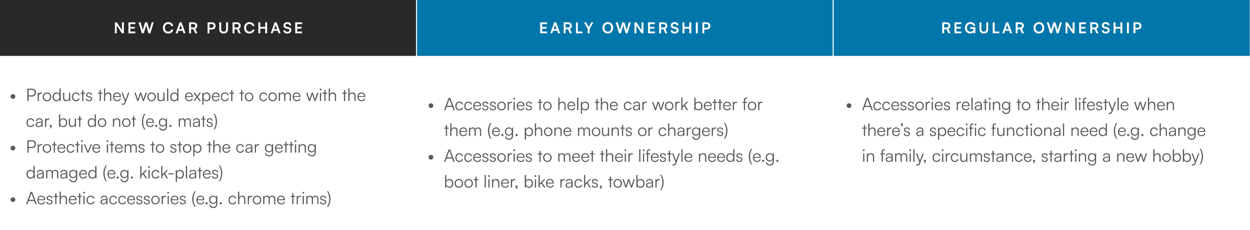 Although the majority of accessories are bought at the time of new car purchase, there are many opportunities at the ownership stage that we are not catering for yet. Especifically, accessories that relate to making the car work better for customers as their lifestyle needs change.